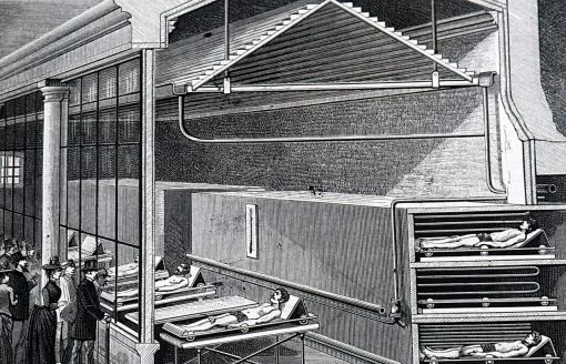 Teşhis edilebilmeleri için camlı bir bölme arkasında mermer masalar üzerine, hafif eğimli olarak yerleştirilen ölü bedenleri izlemeye gelen meraklı bir kalabalık peydah olmuştu. Bazı günler kalabalık ziyaretçi ordusu yüzünden, çoğu kişi ölüsünü bulamadan geri dönebiliyordu. Masaların tam üstünden geçen borulardan akan soğuk su, bozulmayı önlemek ve geciktirebilmek için ölü bedenlerin üzerine akıtılıyordu. Yapılan sergilemeye rağmen çoğu ceset teşhis eden çıkmaması yüzünden kimsesizler mezarlığına, çoğu kere de üst üste olmak üzere gömülüyordu.
